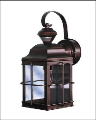 This carriage-style outside wall lamp offers great looks, plus the convenience of a built-in motion detector and dusk-to-dawn sensor. A handy security feature around garages and patios, the motion sensor has a 180 degree, 30 foot range. The design also comes with the Dual Brite two-level lighting feature, which brightens the light output from the light when motion is detected. It comes in an antique bronze finish with panels of beveled glass. Takes one 100 watt bulb (not included). 14 3/4" high and 6 3/4" wide, extends 8 1/2" from the wall.